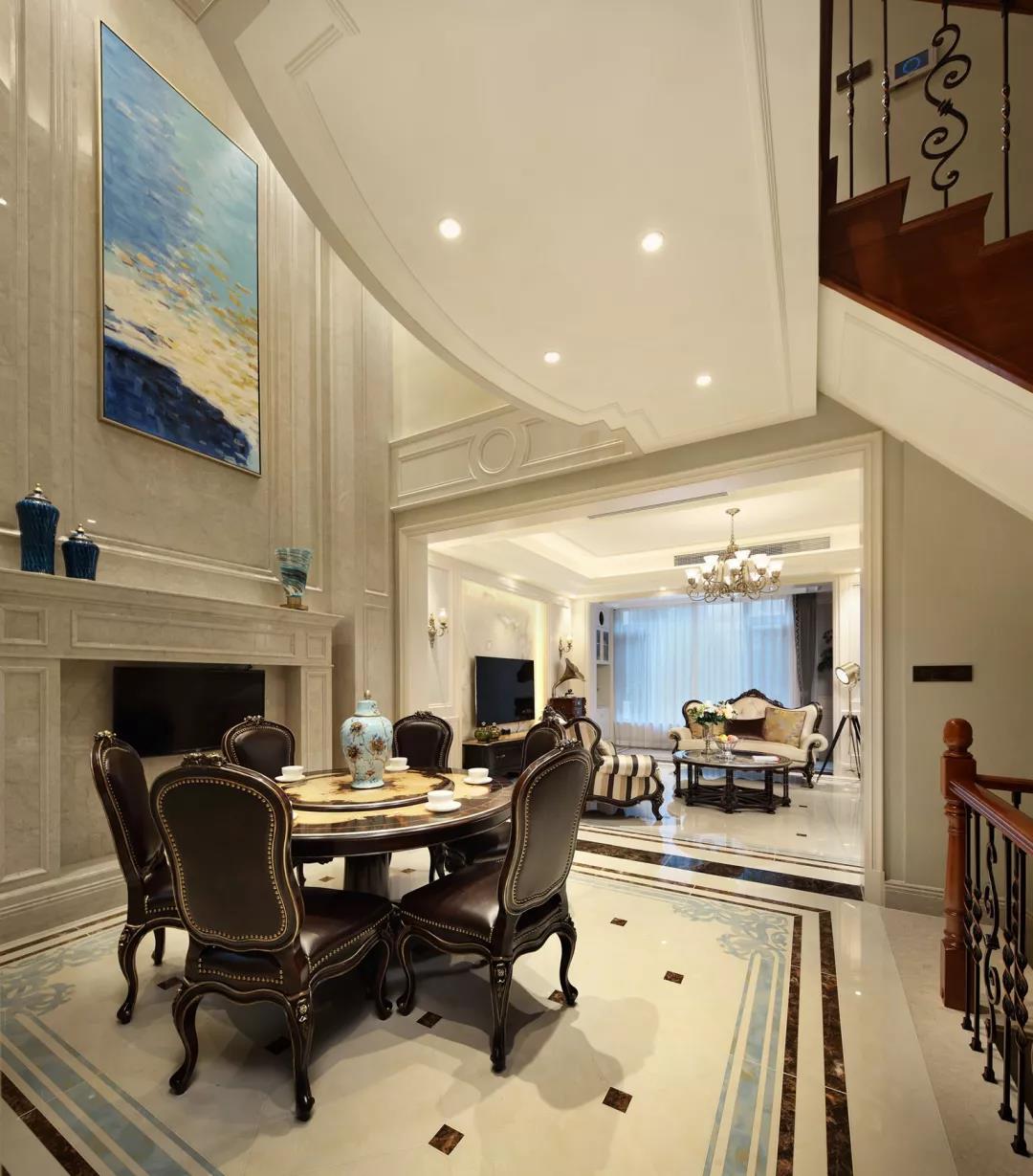 餐廳則是用餐與家庭對話的場所,采用大理石挑空的背景,使空間感得以延伸,彰顯尊貴與大氣。