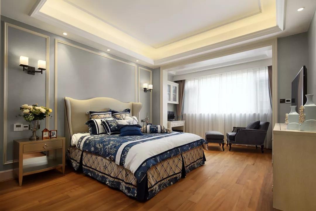 灰藍色,平和又沉靜的調和色彩采用時尚大氣的暖灰色床靠背,與整個房間的色系靈活結合。